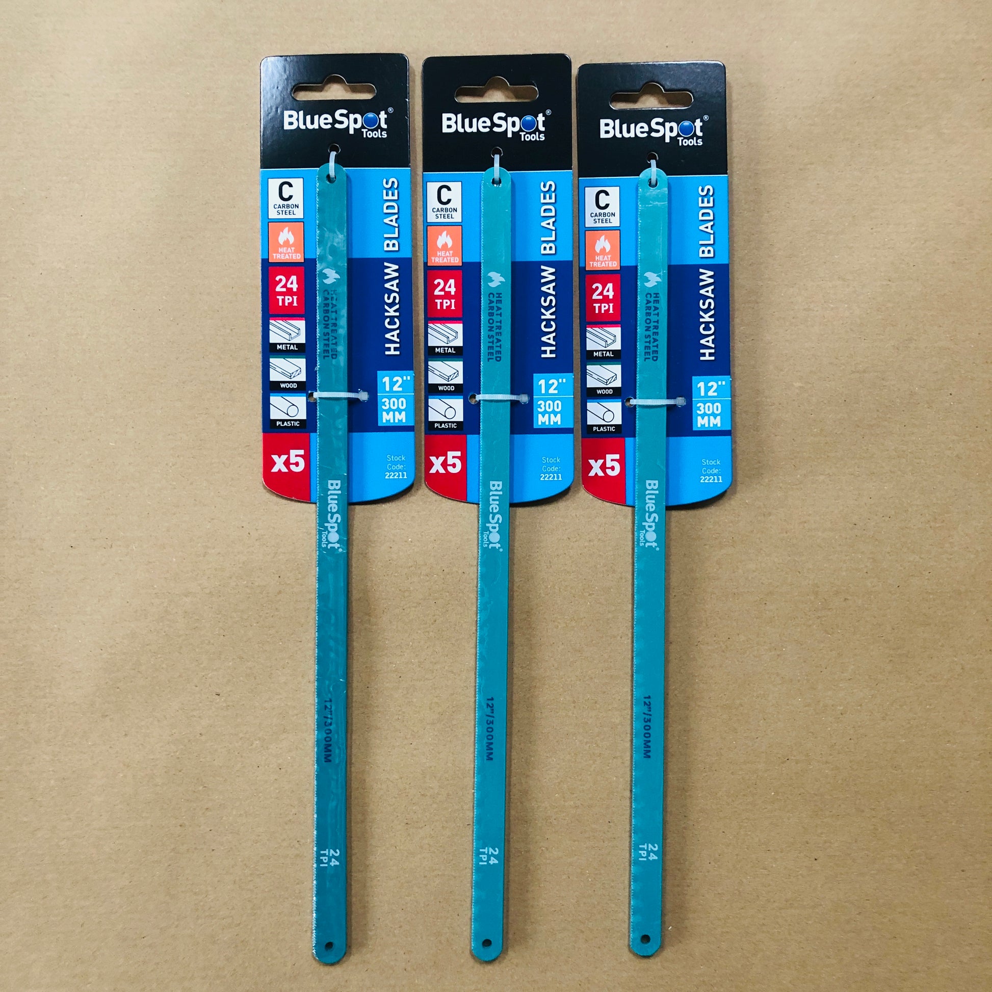 The Blue Spot Tools 5 PCE 300mm (12") 24 TPI hacksaw blades are manufactured from heat treated Carbon steel for an increased cutting performance and hardness, with 24 teeth per inch making them ideal for cutting metal, plastic and certain types of wood. The blades are 300mm (12") in length and will fit most 300mm (12") hacksaw frames.